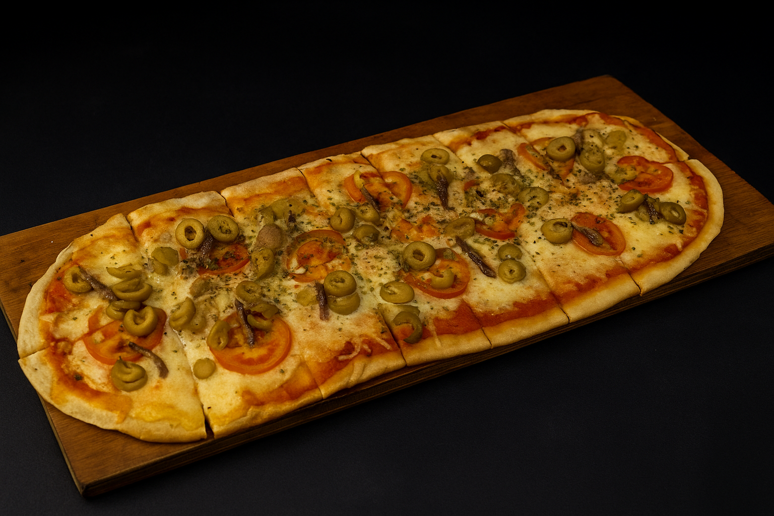 salsa, queso, tomate, aceitunas, anchoas.